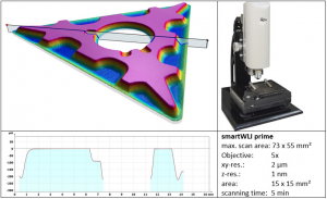 Using powerfull FPGA’s or grafic cards enables Speedytec the systems to an vertical scanning speed up to 150 µm still using the full xy resolution of an 2 MP camera. This peak values for white light interferometric sensors can be used to scan large objects with atomar height resolution as well as extrem high point densities. The algorithms are optimized for best results on steep flanks.