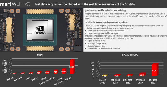 Hochauflösende Hochgeschwindigkeits-Kameras sind generell notwendig, um hochauflösenden 3d Messungen mit optischen 3D Sensoren in akzeptabler Messzeit vorzunehmen. Diese erzeugen aber auch große Mengen an Bilddaten die nur mit hohem Aufwand gespeichert werden können. Die Lösung bietet die Speedytec® Technologie mit der Datenverarbeitung auf aktuellen Grafikkarten mit bis zu ca. 100-facher Rechenleistung aktueller CPUs. Dies ermöglicht die Berechnung von 3D Daten in Echtzeit ohne zeitaufwendige Speicherung der Bilddaten.