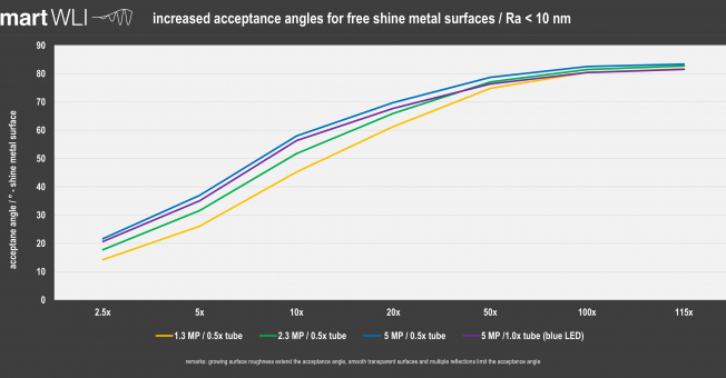 Je steiler ein Oberflächenbereich geneigt ist, desto schwieriger wird die korrekte Messung dieses Bereiches da immer weniger Licht zurück reflektiert wird uns das Signal durch Mehrfach – Reflektionen beeinträchtigt werden kann. Die smartWLI Serie erlaubt durch die eingesetzte Rechenleistung die korrekte Erfassung kleiner Signale und die Messung von wesentlich stärker geneigten Oberflächen, als es mit vergleich-baren Systemen möglich ist.